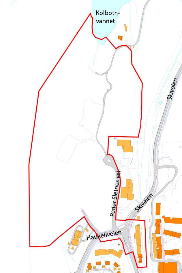 Planområdet er markert med rødt og ligger ved den sørlige enden av Kolbotnvannet.