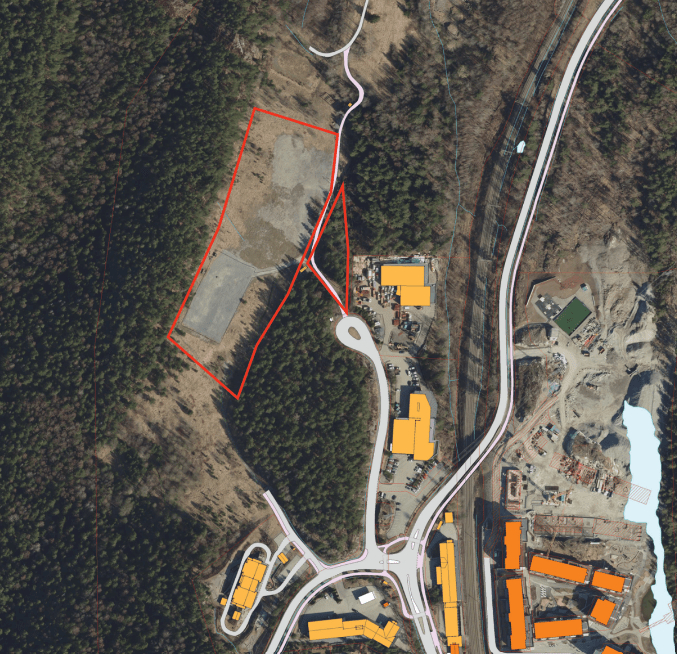 Foreløpig planer: boliger innenfor rød firkant, og parkering innenfor rød trekant. Dette er en gammel fylling som er planert ut.
